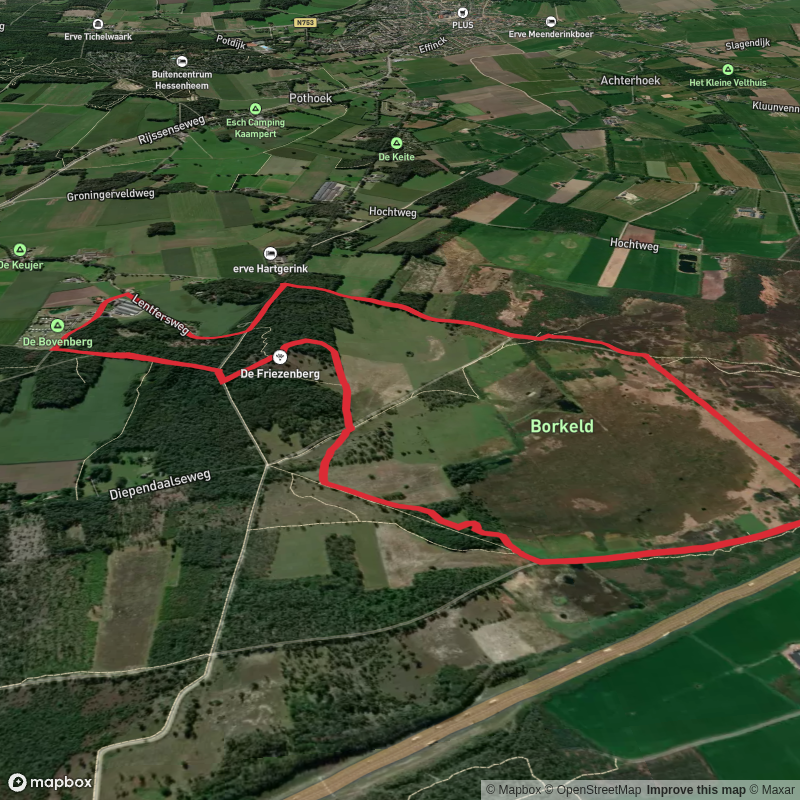 De Borkeld Rode Wandelroute at 1.3 km. Get off line access to Fastfood, parking, gate, and information locations and much more with a Hiiker subscription.