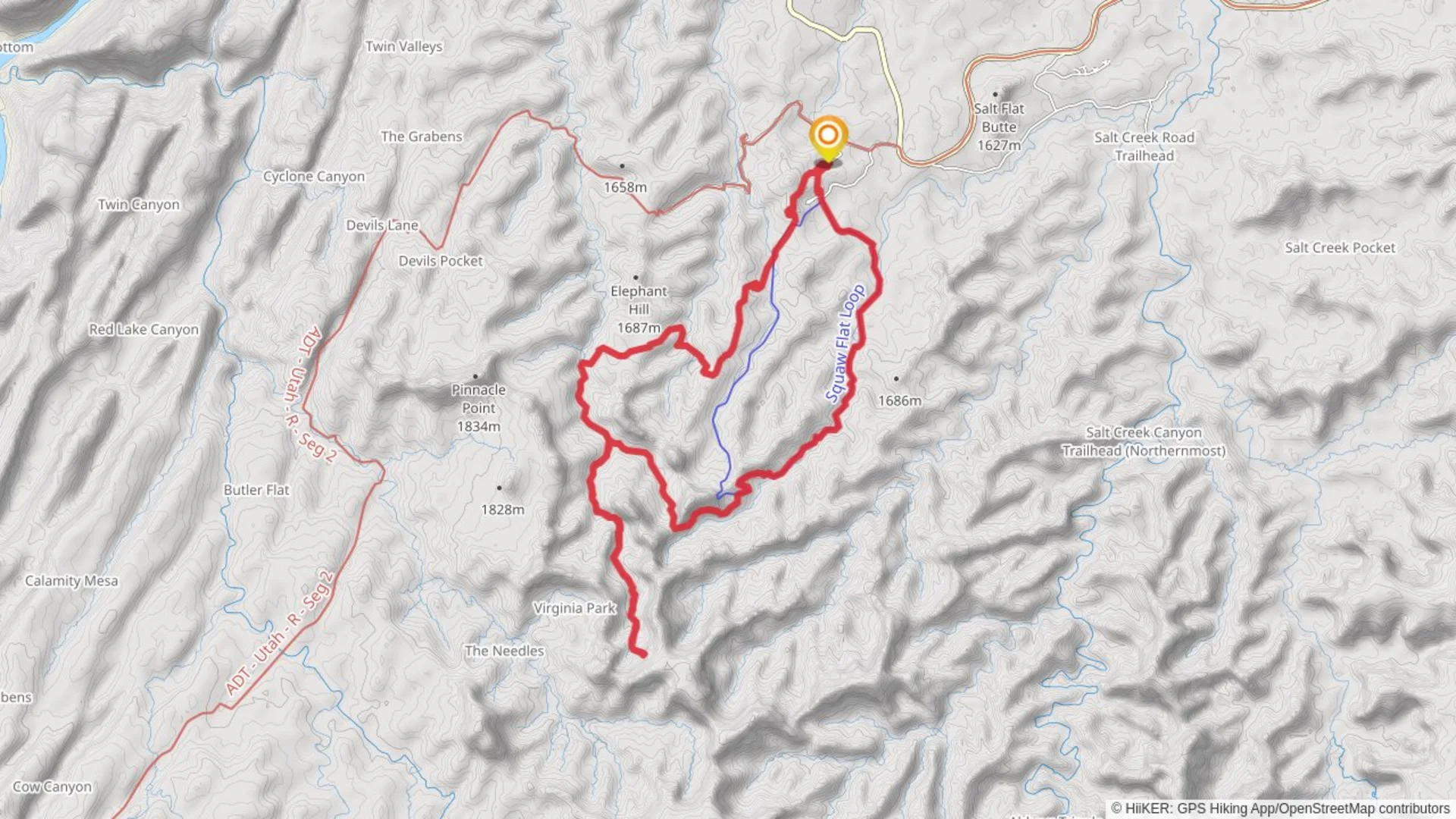 Starting your adventure near San Juan County, Utah, the Big Spring to Elephant Canyon TrailSquaw Flat Trail is a captivating loop trail that spans approximately 24 kilometers (15 miles) with an elevation gain of around 1000 meters (3280 feet). This medium-difficulty trail offers a diverse range of landscapes, from lush springs to rugged canyons, making it a must-visit for any avid hiker.### Getting There To reach the trailhead, you can drive to the Squaw Flat Campground, located within the Needles District of Canyonlands National Park. If you're relying on public transport, the nearest major city is Moab, Utah. From Moab, you can take a shuttle service to the park, although availability may vary, so it's best to check in advance.### Trail Overview The trail begins at the Squaw Flat Campground, a well-marked starting point that offers ample parking and basic amenities. As you set off, you'll quickly find yourself immersed in a landscape of towering rock formations and expansive desert vistas.### Key Landmarks and Sections#### Big Spring Approximately 3 kilometers (1.9 miles) into the hike, you'll encounter Big Spring, a lush oasis that provides a stark contrast to the surrounding arid environment. This is a great spot to take a break and refill your water bottles, as the spring offers fresh, potable water.#### Elephant Canyon Continuing on, around the 8-kilometer (5-mile) mark, you'll enter Elephant Canyon. This section of the trail is characterized by its narrow passages and towering canyon walls. The elevation gain here is more pronounced, so be prepared for a bit of a climb. The canyon is also home to a variety of wildlife, including bighorn sheep and various bird species, so keep your eyes peeled.#### Historical Significance The region is rich in Native American history, with numerous petroglyphs and ancient dwellings scattered throughout the area. These historical markers offer a glimpse into the lives of the Ancestral Puebloans who once inhabited this land. Be respectful and avoid touching or disturbing these sites.### Navigation and Safety Given the trail's complexity, it's highly recommended to use a reliable navigation tool like HiiKER to keep track of your progress and ensure you stay on the correct path. The trail is well-marked, but having a digital map can provide additional peace of mind.### Flora and Fauna The trail offers a diverse range of plant life, from hardy desert shrubs to vibrant wildflowers, especially in the spring. Wildlife is abundant, with frequent sightings of mule deer, lizards, and various bird species. Always maintain a safe distance from wildlife and follow Leave No Trace principles to preserve the natural beauty of the area.### Final Stretch As you loop back towards the Squaw Flat Campground, the trail offers panoramic views of the surrounding landscape, providing a fitting end to your journey. The final few kilometers are relatively flat, allowing you to cool down and reflect on the incredible sights you've experienced.This trail is a perfect blend of natural beauty, historical significance, and moderate physical challenge, making it an ideal choice for hikers looking to explore the unique landscapes of Canyonlands National Park.