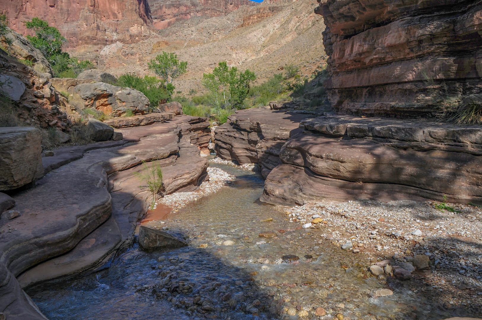 As you progress towards Deer Creek, the trail becomes more rugged, with narrow sections that skirt the edges of steep drop-offs. Caution is advised in these areas, especially for those with a fear of heights. The trail's descent into the Deer Creek area presents another dramatic scene as Deer Creek cascades through a slot canyon before plunging over Deer Creek Falls into the Colorado River.