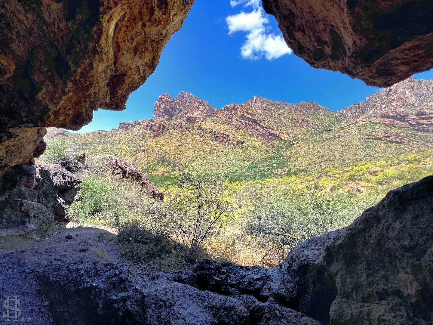 #### The Shaka Cave Continuing on, at around the 3 km (1.8 miles) mark, you'll reach The Shaka Cave. This unique geological formation is named for its resemblance to the Hawaiian "shaka" hand gesture. The cave provides a cool, shaded spot to rest and take in the panoramic views of the Superstition Mountains. It's also a great place to explore the fascinating rock formations and perhaps spot some local wildlife.