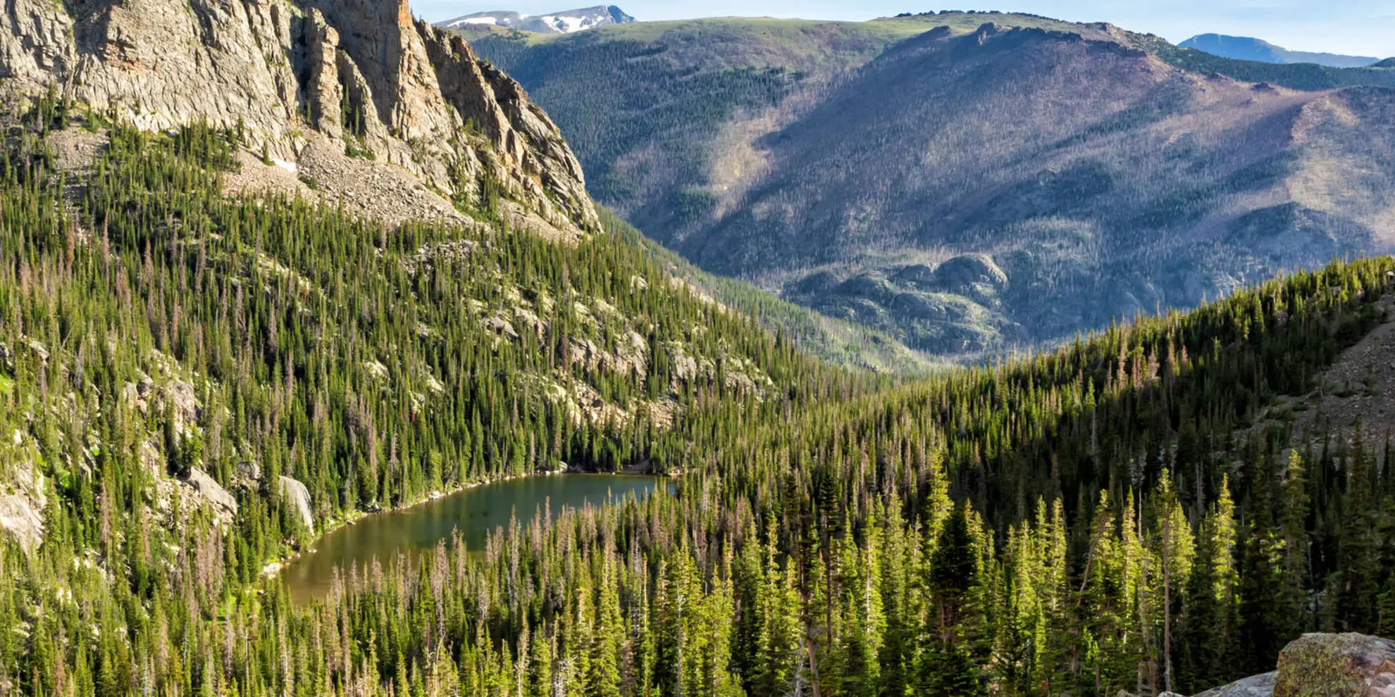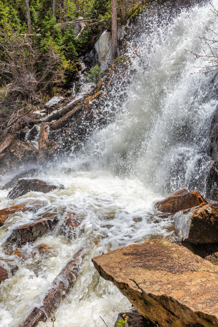 As the trail progresses, the incline becomes more pronounced, leading to The Pool, a notable landmark where the waters of Fern Creek and the Big Thompson River meet. This is a great spot to rest and enjoy the natural symphony of rushing water. Beyond The Pool, the trail steepens, and hikers will climb roughly 365 meters (1200 feet) over the next 4.8 kilometers (3 miles) to reach Fern Lake, a picturesque alpine lake surrounded by rugged peaks.