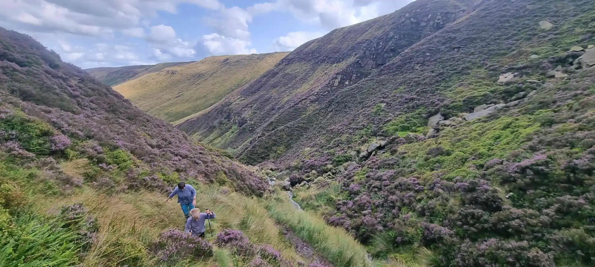 The route begins by following a quiet country lane before joining a footpath that traces the course of Blackden Brook. The initial 2 km (1.2 miles) are relatively gentle, winding through sheep-grazed fields and past dry-stone walls, before the path steepens as you approach the brook itself. Here, the landscape becomes wilder, with heather and bilberry lining the banks and the sound of water tumbling over gritstone boulders. The ascent alongside Blackden Brook is the most challenging section, gaining around 300 metres (985 feet) in just under 2 km (1.2 miles). The path is rocky and can be slippery after rain, so sturdy footwear is essential.
