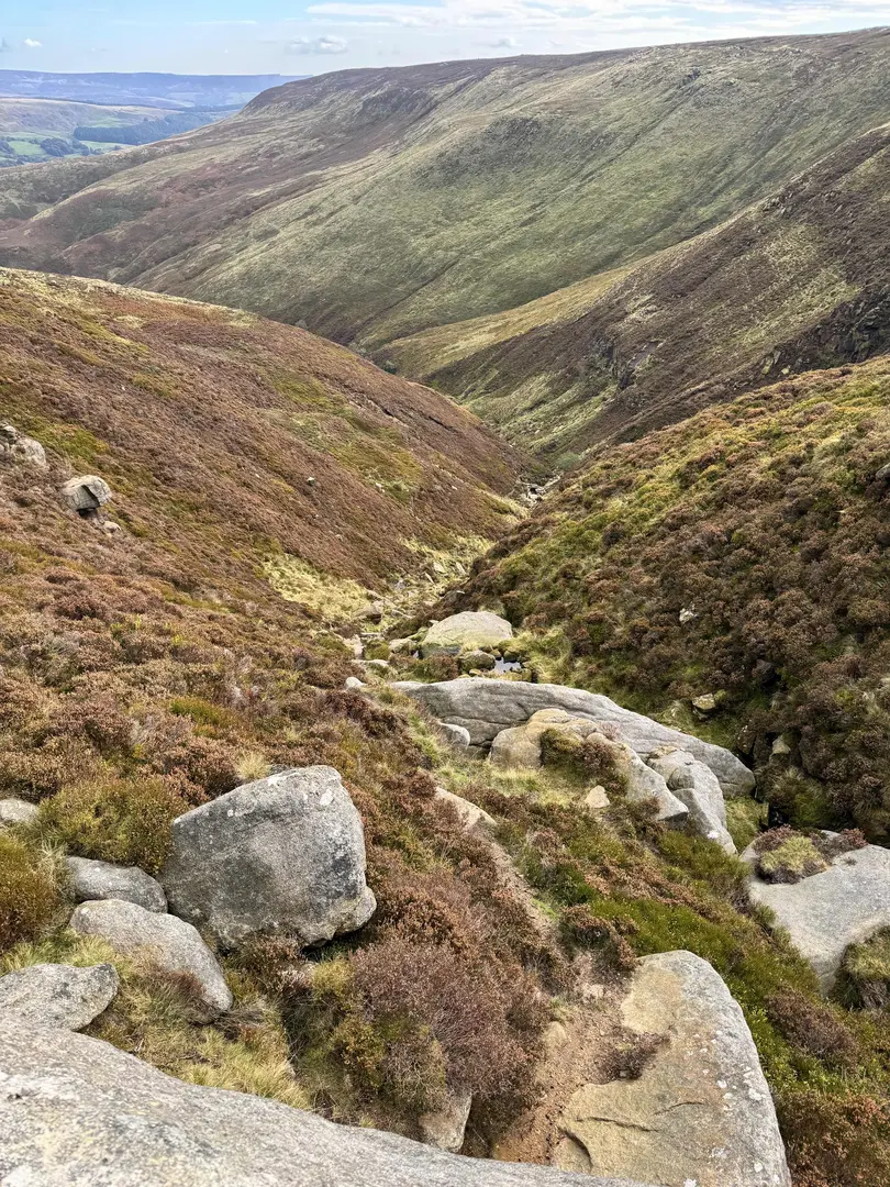Emerging onto the Kinder Plateau, the terrain flattens out, offering expansive views across the moorland. This area is known for its peat bogs and unique gritstone formations, shaped by centuries of wind and rain. At around the 4 km (2.5 miles) mark, you’ll reach the edge of the plateau, where the landscape opens up to reveal the Upper Ashop valley below. The plateau is home to mountain hares, curlews, and, in summer, the vibrant purple of flowering heather. Navigation can be challenging in poor visibility, so using HiiKER for GPS guidance is highly recommended.