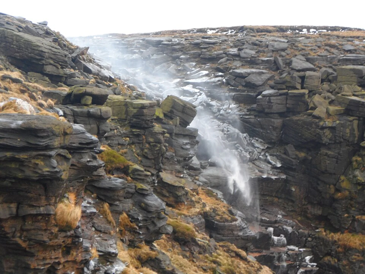 From the reservoir, the trail becomes steeper as you make your way towards Kinder Downfall. This section involves a more strenuous climb, but the effort is well worth it. Kinder Downfall is the tallest waterfall in the Peak District, and on windy days, the water can be seen blowing back upwards, creating a spectacular sight. The area around the waterfall is rocky, so take care with your footing.
