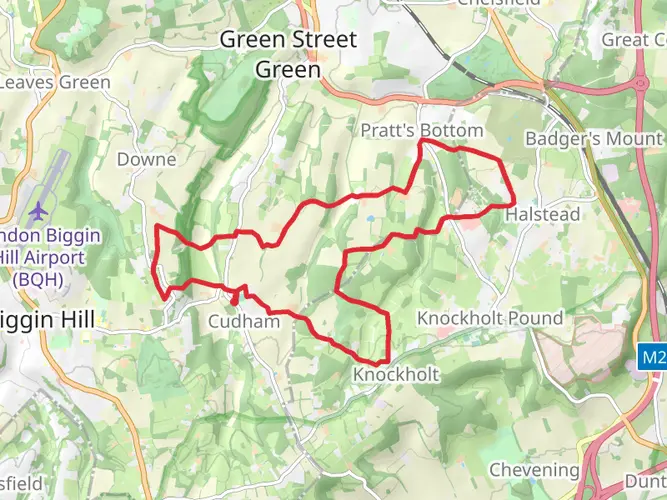 An easy 7.3 km circular walk from Luxted or Downe, ideal for a relaxed half‑day outing. Street parking in Downe and three spaces beside Telephone booth in Luxted village (see photo). The route undulates gently with about 146 m of ascent and 158 m of descent, offering mild climbs but nothing strenuous. There are benches in Downe and a small trees shop. The walk explores quiet country lanes and footpaths, with chances for countryside views and glimpses of traditional Kentish farmland and woodland along the way. There are three pubs in Downe and one in Cudham. Nearby is Charles Darwin home (Downe House - paid entry) and Christmas Tree Farm (paid entry)