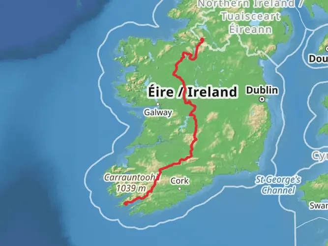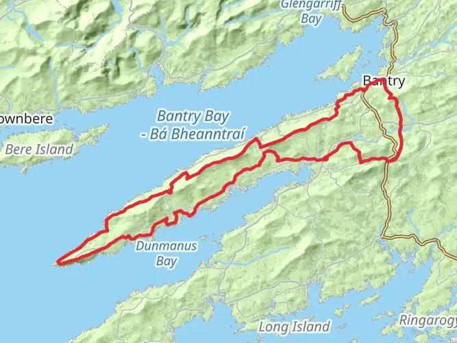 An easy 8.5 km out‑and‑back hike starting near the rugged coast of County Cork, gently climbing about 165 m with around 95 m of descent. The route offers rolling countryside views, scattered farms, and glimpses of nearby hills as you head north toward the finish. With moderate elevation changes and a 2‑hour duration, it’s suitable for most walkers looking for a relaxed rural Irish landscape experience.