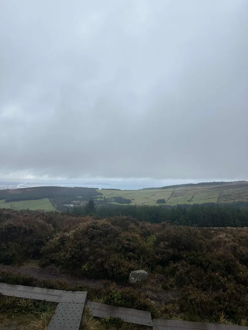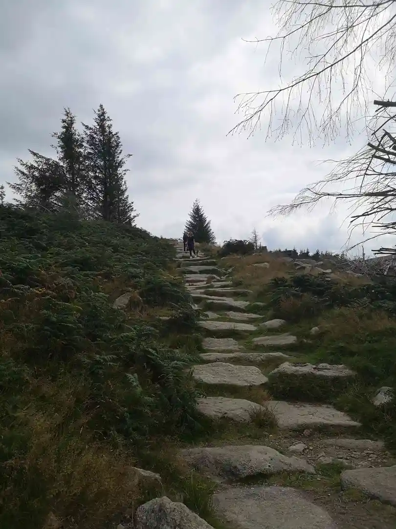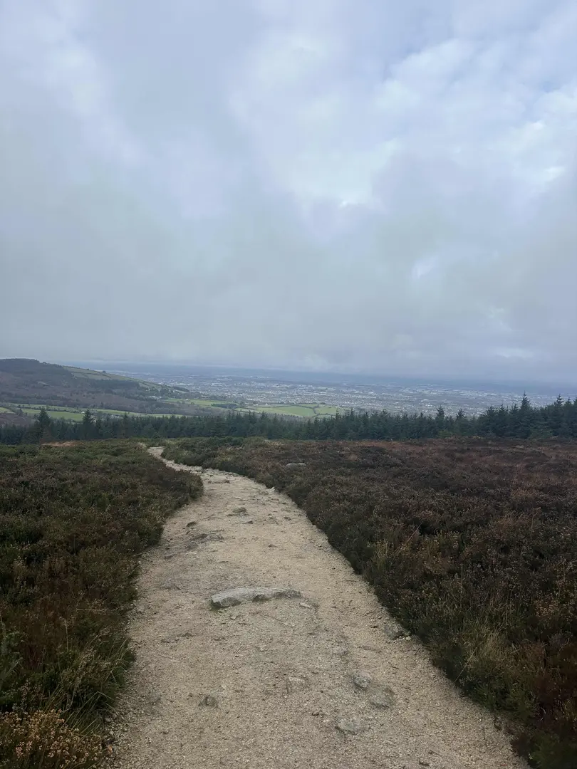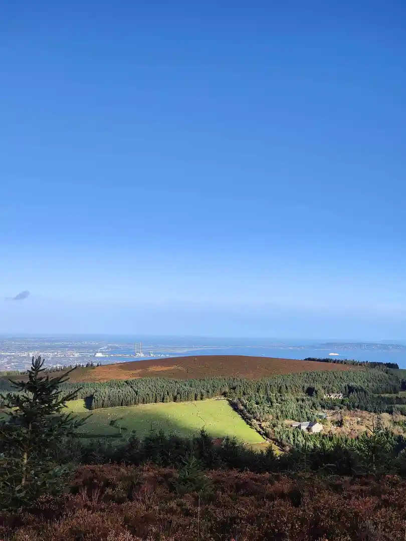 Emerging from the trees around the halfway point, the trail opens onto heathland dotted with heather and gorse. The climb becomes more exposed, offering sweeping views over Dublin city, the Irish Sea, and the Wicklow Mountains. On clear days, the panorama stretches as far as Howth Head and the Sugarloaf. The summit area, at roughly 2.5 km (1.5 miles) from the start, is marked by a prehistoric burial cairn—an ancient passage tomb dating back over 4,000 years, highlighting the region’s archaeological significance.