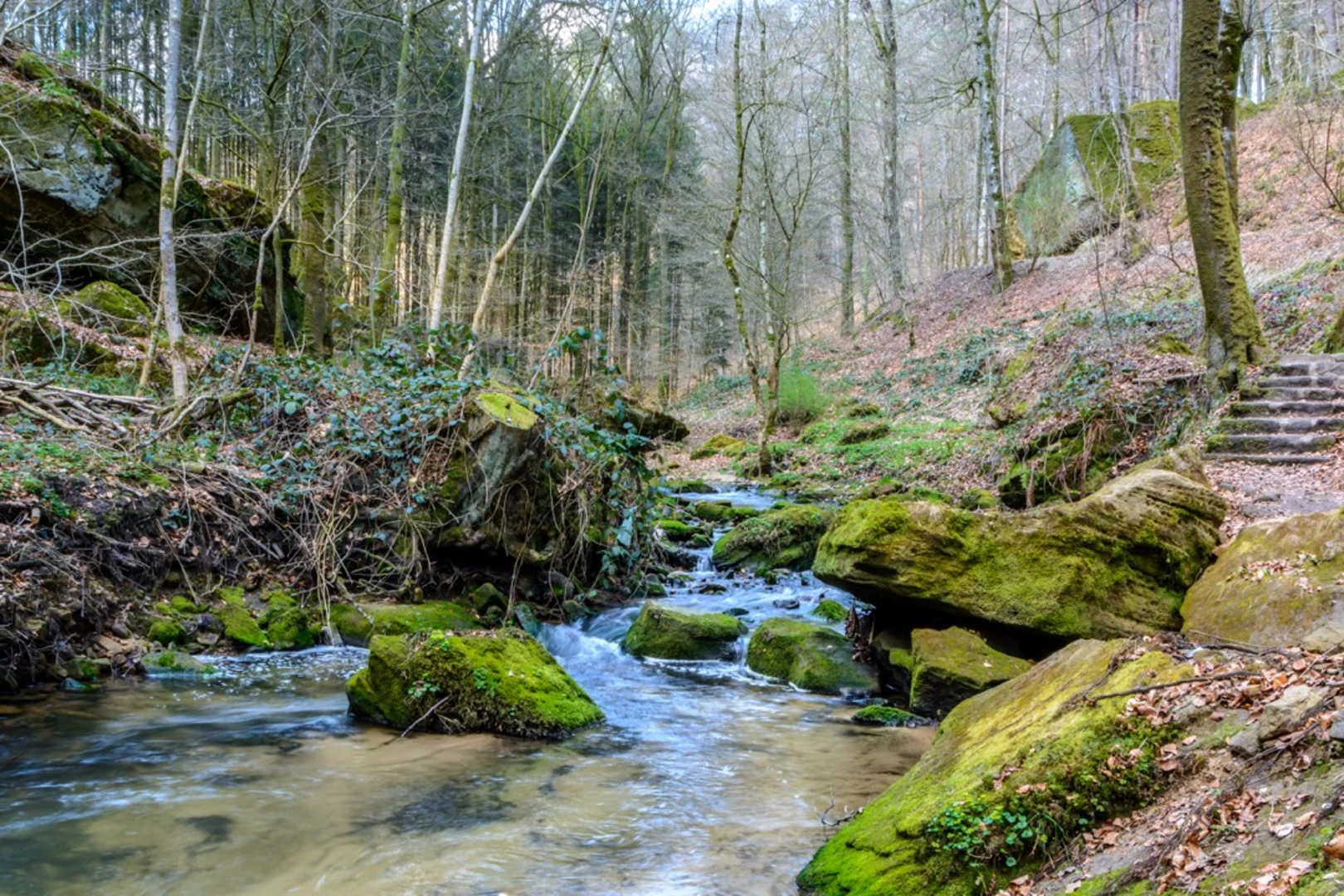 The trailhead for Mullerthal Trail 3 is conveniently located near Canton Echternach, which is well-serviced by public transport. Buses frequently run from Luxembourg City to Echternach, where you can disembark near the starting point of the hike. For those driving, parking is available in the vicinity of the trailhead, allowing for easy access to begin your adventure.