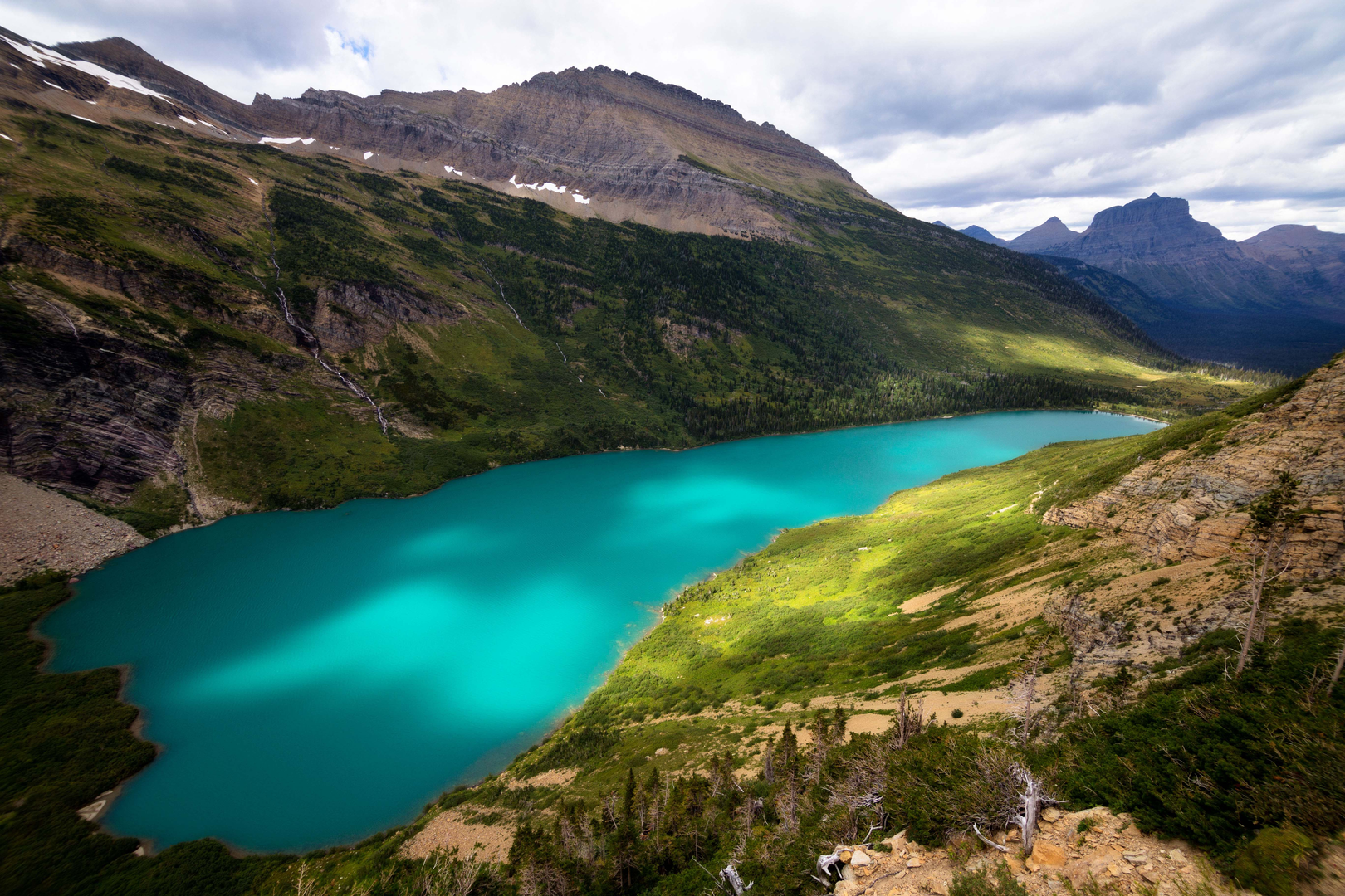 The last leg of the trail involves a final ascent to Lincoln Pass, followed by a steep descent to Lake McDonald, the largest lake in Glacier National Park. This section can be particularly challenging due to the loose terrain and sharp drop-offs, so careful footing is necessary.