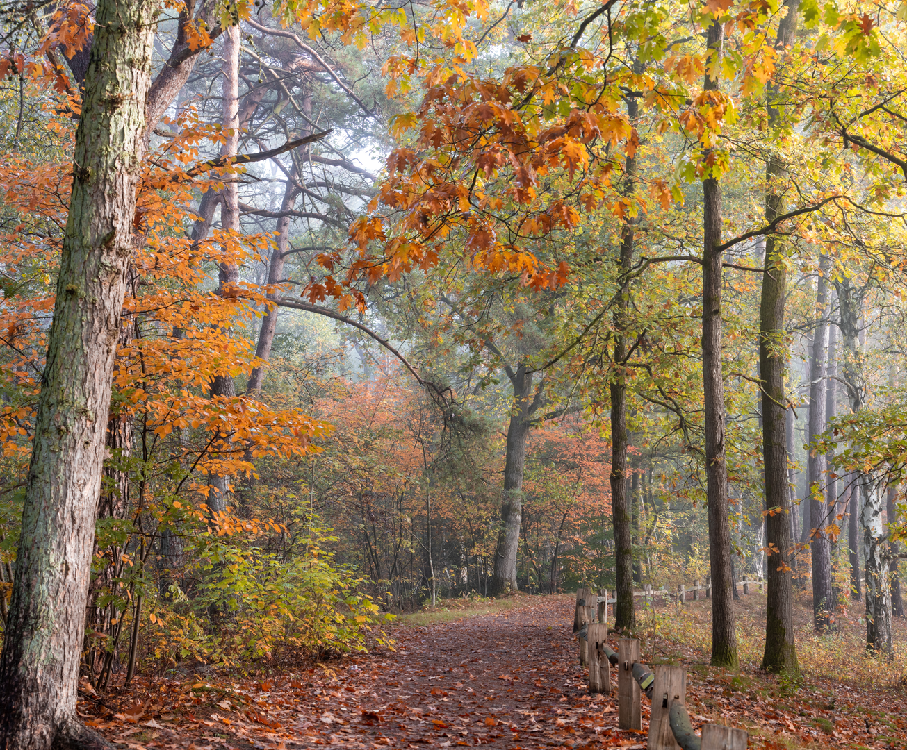 Woodland and heath-edge character - Expect mixed woodland (oak/beech patches and planted conifers in places), with occasional open sandy clearings and heath-edge vegetation depending on the exact connectors used. - In drier sections, sandy soils can make the surface feel softer and slightly slower; after rain, low spots can hold water and become slick.