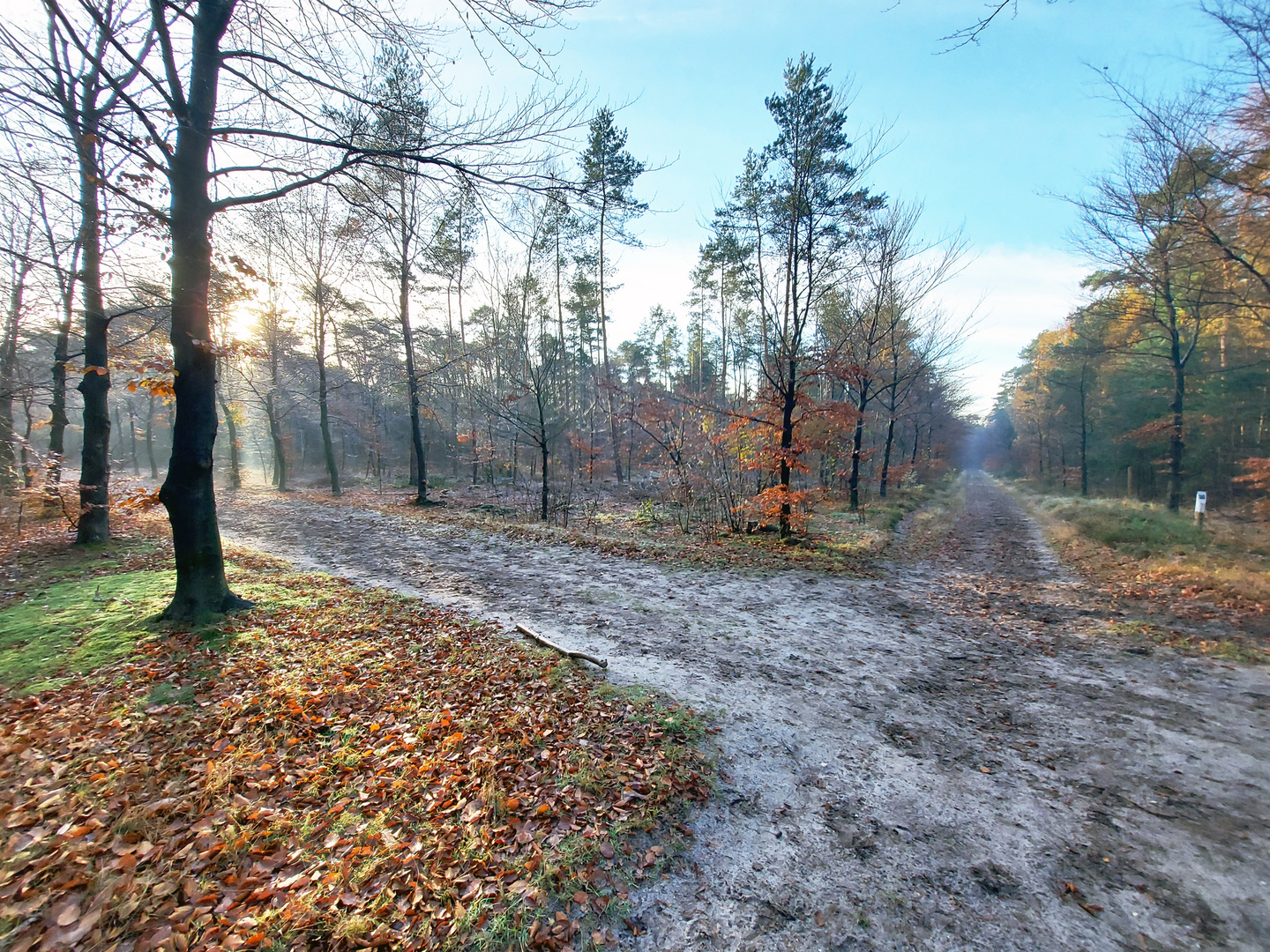 Shortly after setting out, the trail passes through the Hoog Zand area, a stretch of open heath dotted with juniper bushes and scattered pine trees. This section is particularly scenic in late summer when the heather blooms in vibrant purple hues. At around 2 km (1.2 miles), the path enters denser woodland, where mature beech and oak trees provide ample shade and a habitat for native birdlife such as woodpeckers and nuthatches.