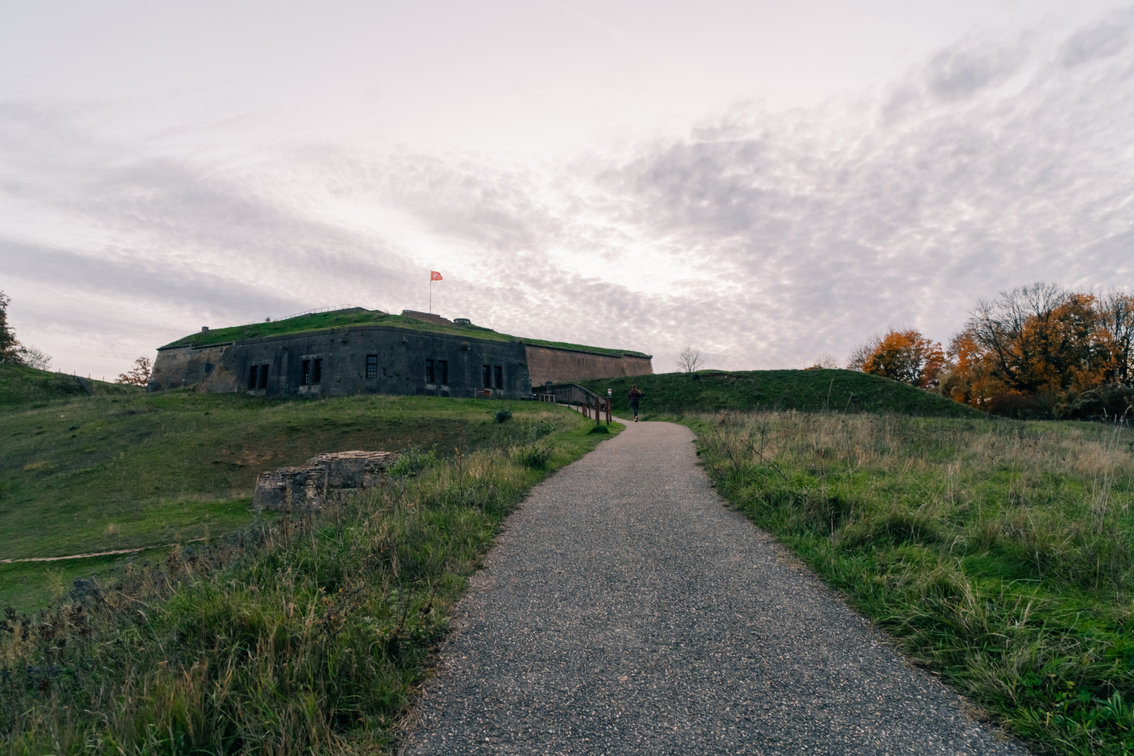 The hike begins near Fort Sint Pieter, located at Luikerweg 71, 6212 NH Maastricht. For those arriving by car, parking is available at the fort's parking lot. If you're using public transport, buses from Maastricht's central station stop approximately 200 meters from the starting point, providing convenient access to the trailhead.
