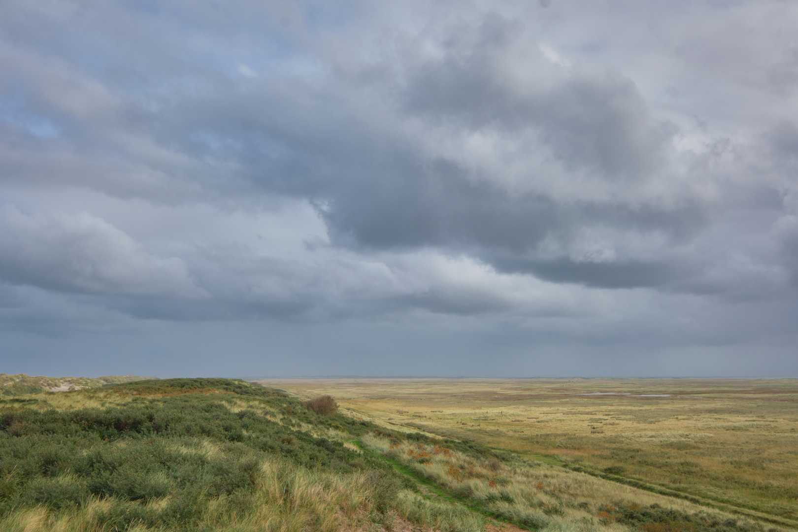 As you transition out of the trees, the landscape opens into classic Wadden-island dune scenery—low ridges, wind-shaped sand, and hardy dune vegetation. Even without big climbs, you’ll notice constant micro-relief: small rises, shallow bowls, and sheltered hollows. These open sections are where you’ll feel the weather most directly: