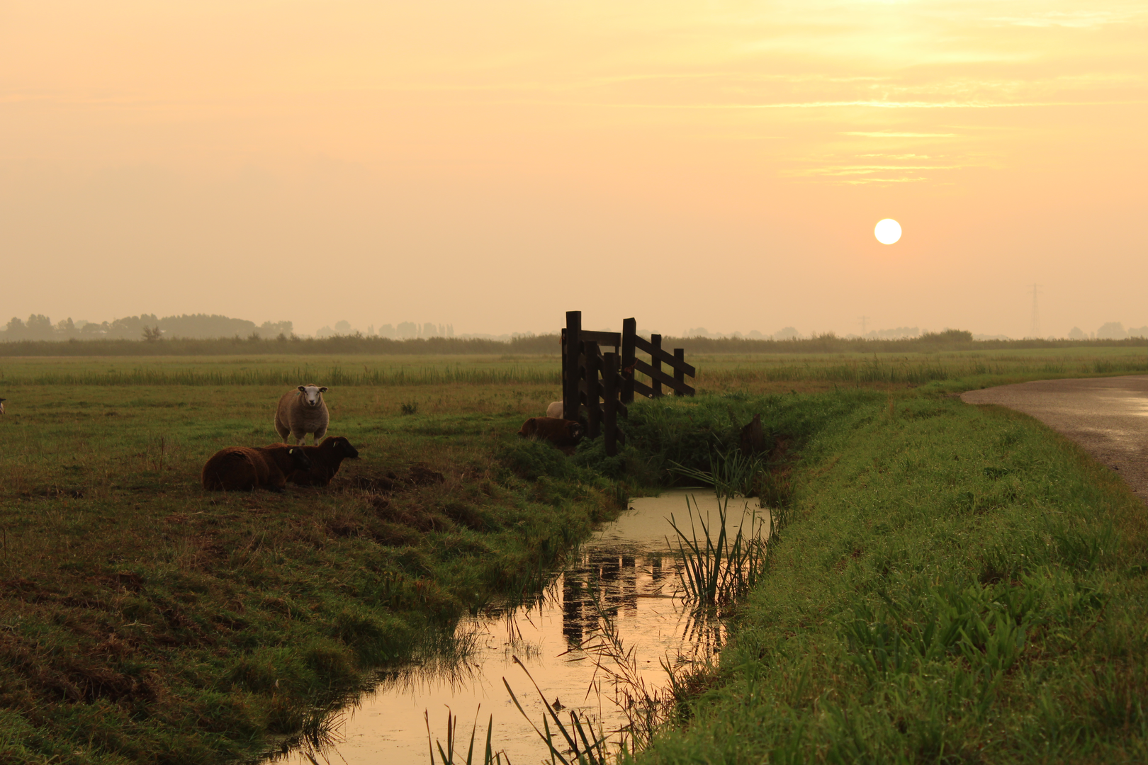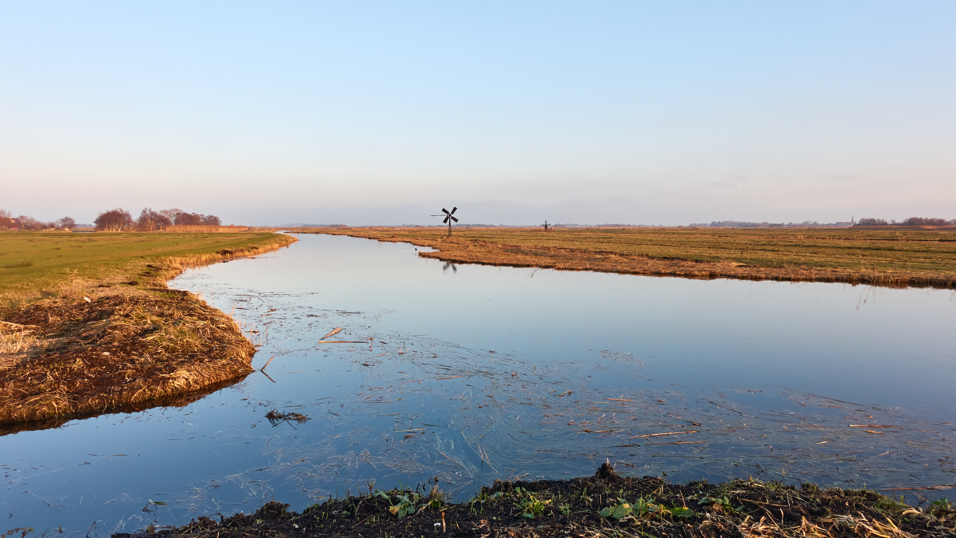 This is classic lowland habitat: open fields, canals, reed edges, and scattered tree lines.