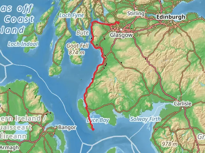 This easy custom route covers about 12.2 miles with around 1,130 ft of ascent and 1,550 ft of descent, starting near 55.60133, -4.368916 and finishing close by at 55.60069, -4.372516. Expect a long but gentle outing, ideal for walkers building endurance without steep climbs. The moderate elevation change adds variety to the terrain while remaining accessible, making this a good choice for relaxed, full‑day exploration.