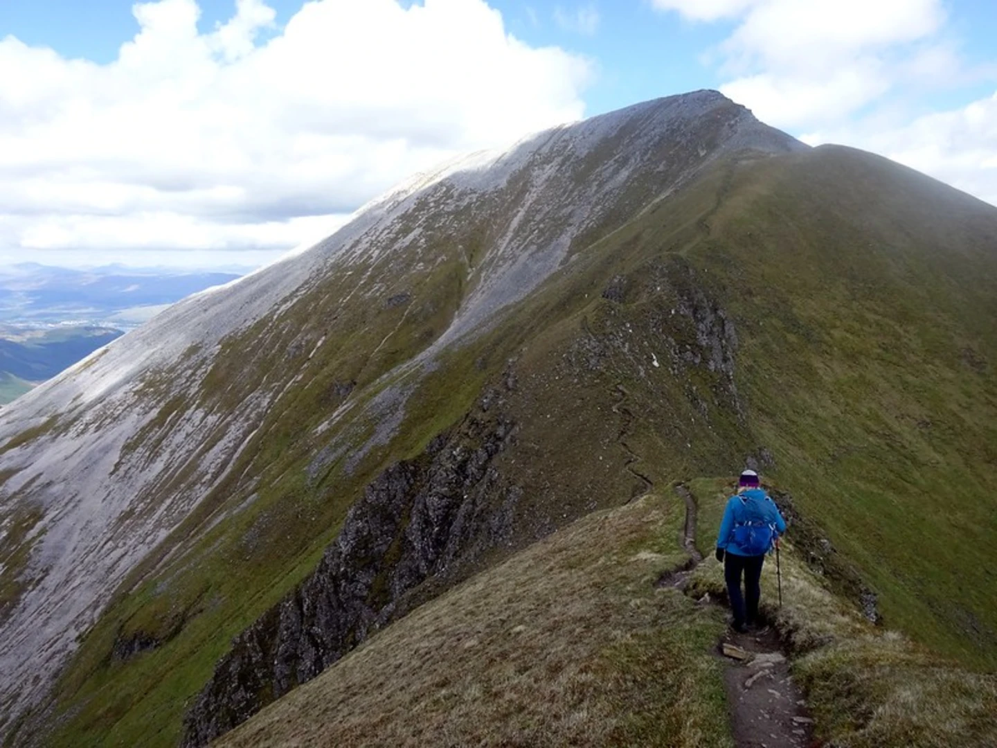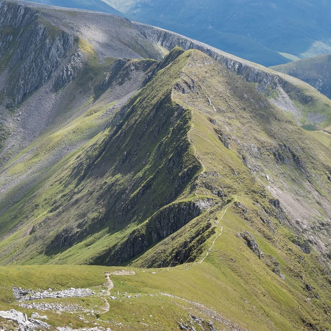 After the gorge, the trail ascends sharply to the ridge of An Gearanach, the first Munro (a Scottish mountain over 914 meters) of the day. From here, the path follows a narrow ridge with breathtaking views of the Mamores range. The ridge walk includes the Munros of Stob Coire a' Chairn, Am Bodach, and then culminates with the ascent of Sgurr a' Mhaim. The 'Devil's Ridge' is a particularly narrow section that provides an exhilarating challenge for hikers.