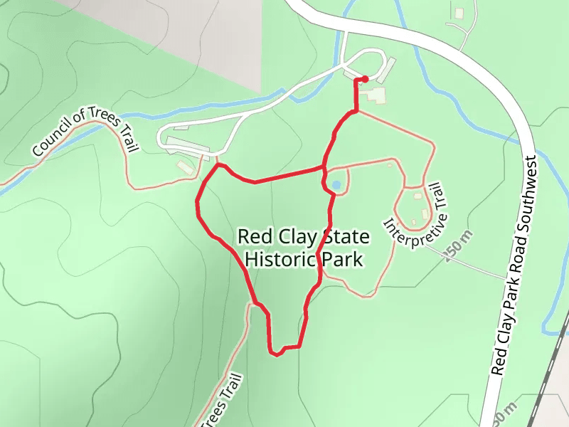 Red Clay State Historic Park Loop - Short at 1.1 km. Get off line access to Healthcare, Shop, Fastfood, and Restaurant locations and much more with a Hiiker subscription.
