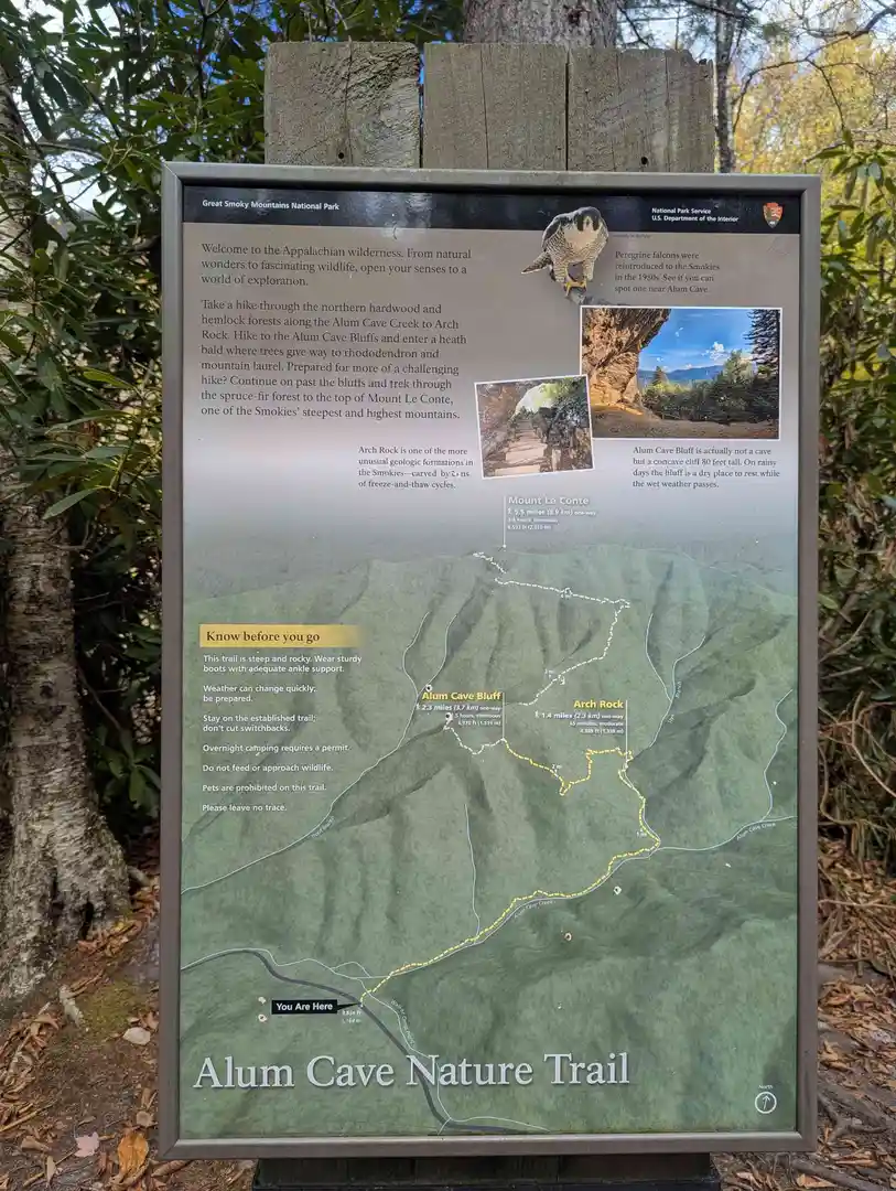 The Peregrine Peak via Alum Cave Trail is a 7.4 km trail that starts in Gatlinburg, Sevier County, Tennessee. Based on our data, the hike is graded as Medium. For information on how we grade trails, please read measuring the difficulty of a hiking trail on hiiker. Also, check our latest community posts for trail updates. This hike can be completed in approx 2 hrs 6 mins. Caution is advised on trail times as this depends on multiple variables. For more info read about how we calculate hike time.