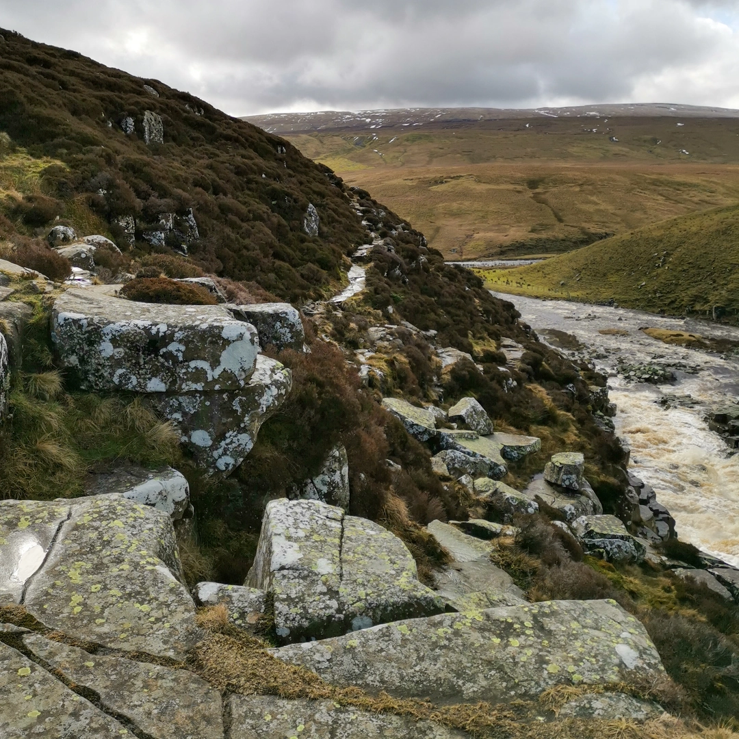 From there, the walk follows the River Tees along a rugged riverside section. This part of the route can be demanding, with rocky ground underfoot and some awkward footing in places. It is a spectacular stretch of landscape, but one that is best suited to confident walkers who are comfortable on challenging terrain.